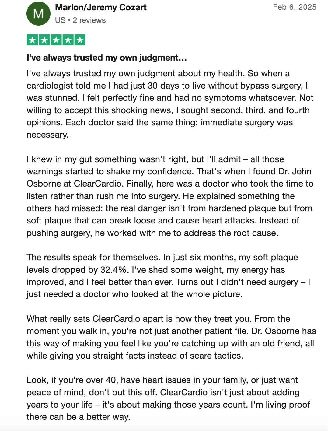 The Patient is a 50-year-old man with a stacked family history of heart disease. His father, aunts, uncles, and brother all suffered major cardiac events. His brother has had eight stents and a bypass. He knew his risk — and for years, he did everything the traditional system told him to do: he exercised, lost weight, watched his diet, and went to a top cardiologist every six months.