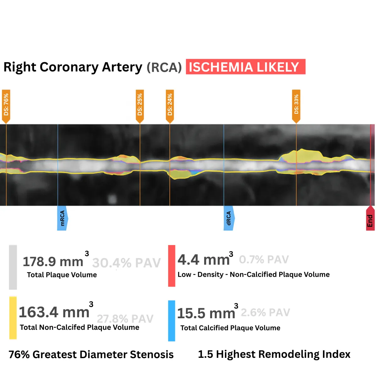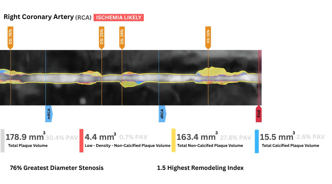 The AI has mapped exact narrowing points, including one at 76% diameter stenosis